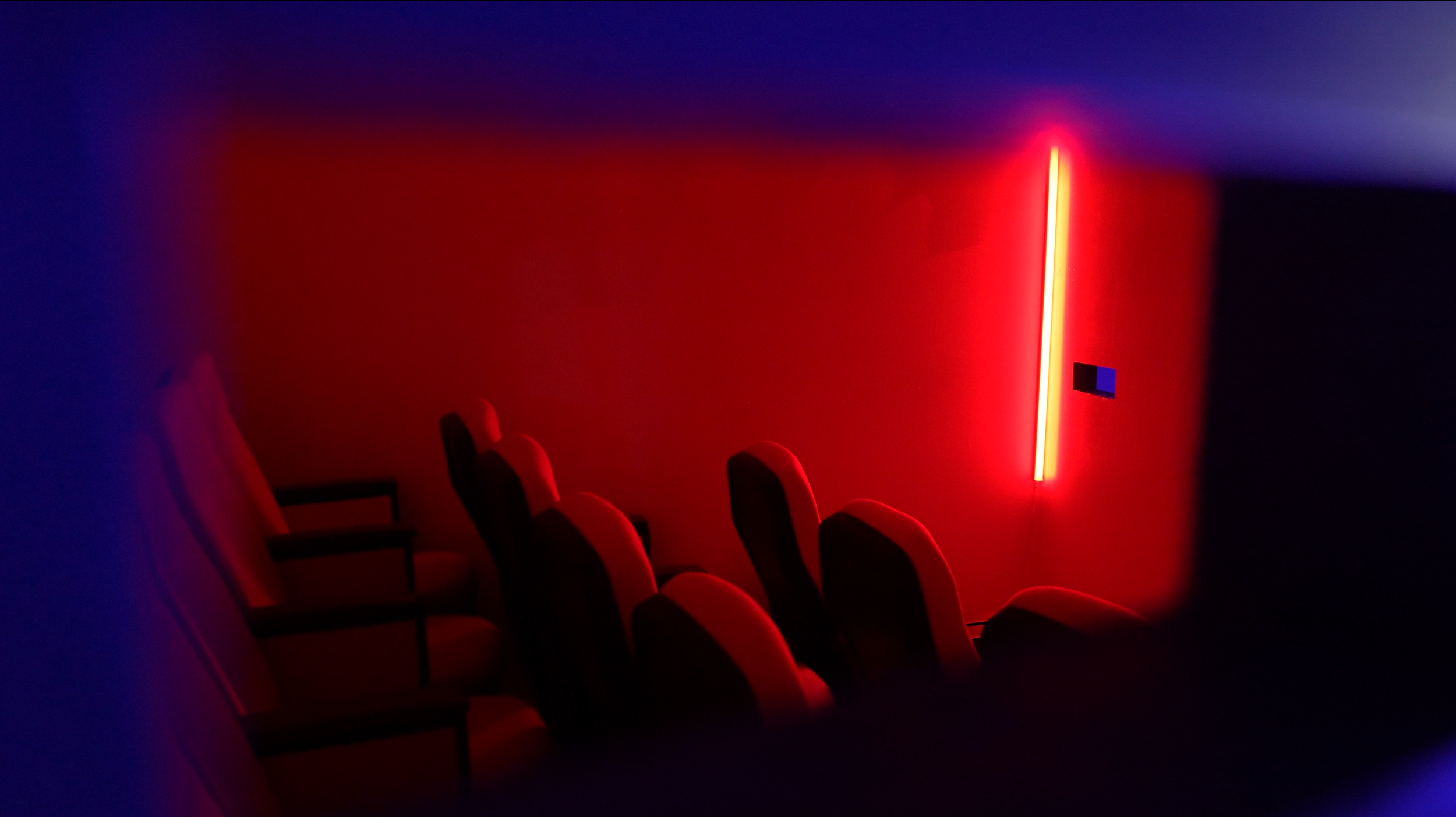 As the audience ascends the stairs, they emerge from a container with an unknown entirety, as the building has been constructed behind them. The interior cinema has been reimagined as a space that cannot be entered, placing the audience behind the screen, under an unknown gaze. Narrow passages, dim lighting, and uncomfortable sounds contribute to the audience’s sensory experience, with the overall space collectively embodying dramatic content.